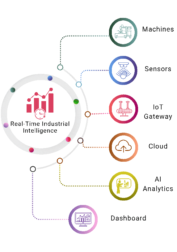 Machines produce data, sensors capture signals, IoT gateway sends it to cloud, AI analyzes patterns, dashboards display insights instantly.