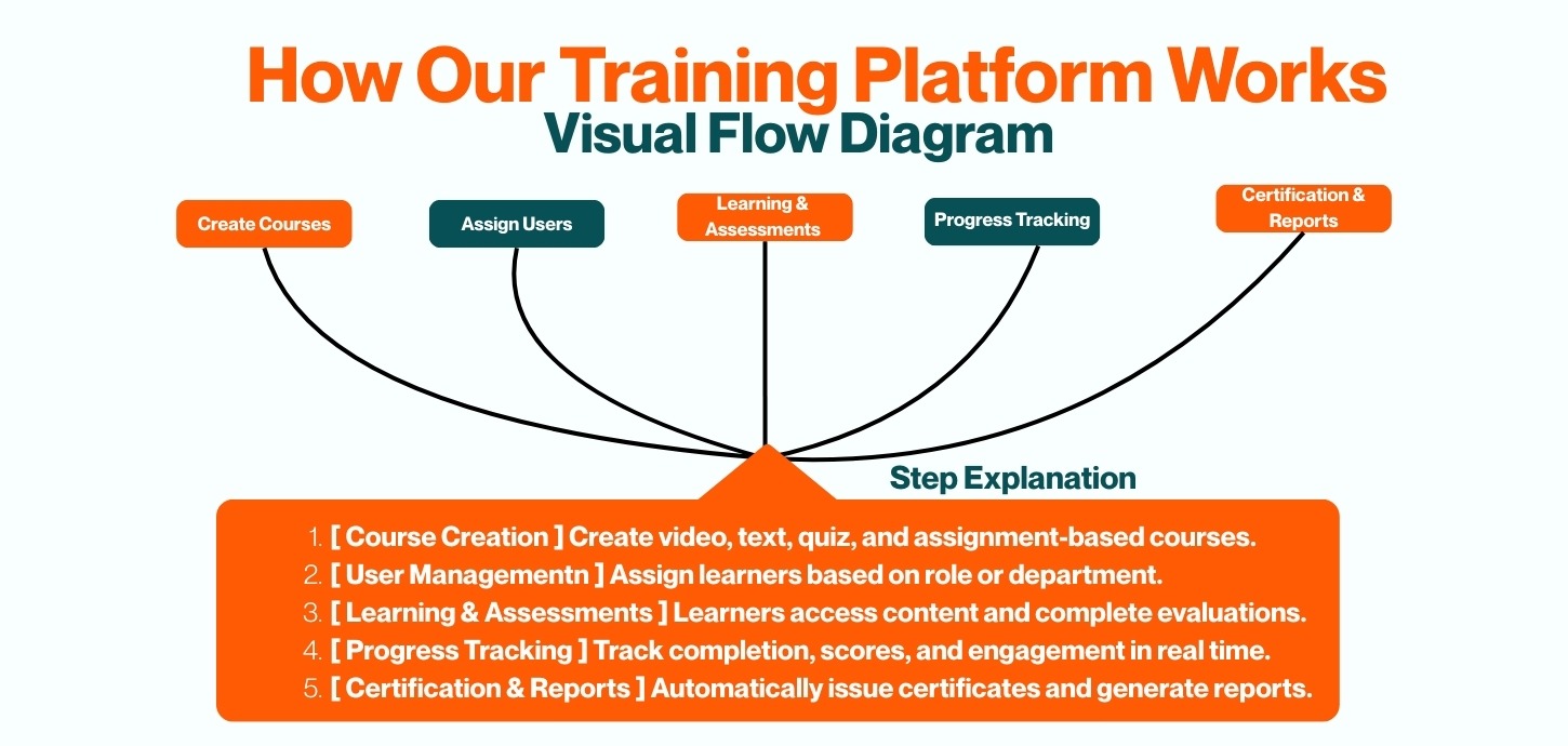 Our training platform offers a seamless experience for course creation, learner management, and progress tracking. From creating interactive courses to issuing certificates, the platform ensures a structured, efficient training process. It simplifies assessments, tracks learner engagement in real-time, and provides comprehensive reports, all in one centralized system.